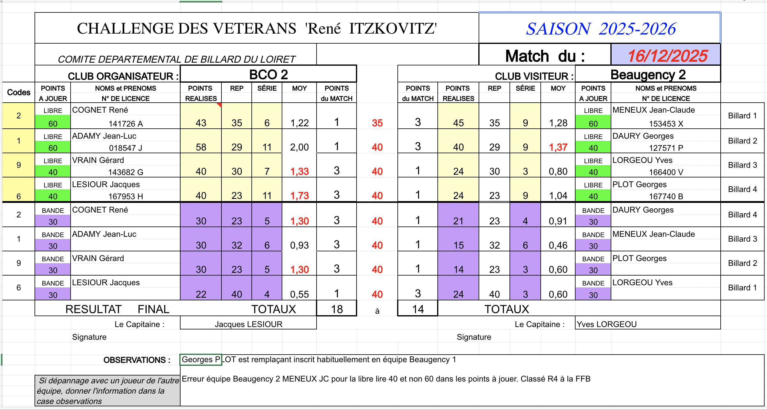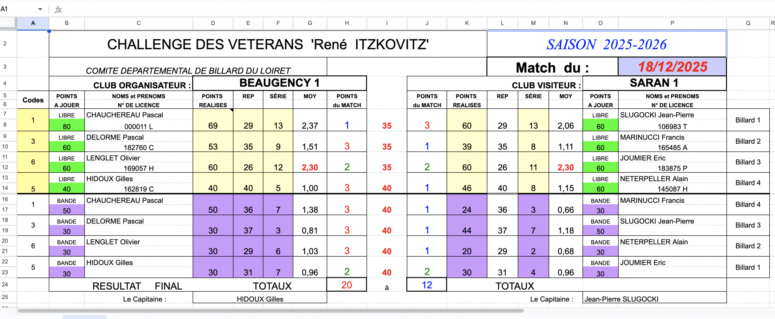 VÉTÉRANS Voir votre moyenne générale.Votre pourcentage de réussite.Le nombre de matchs joués.Les matchs gagnés ou perdus. ICI 👈 CLASSEMENT DES 3 ÉQUIPES AU 8 JANVIER 2026 FEUILLES DE MATCHS DE JANVIER 2026 DE DECEMBRE 2025 DE NOVEMBRE 2025 DE OCTOBRE 2025 18 DECEMBRE(1) 18 DECEMBRE(3) 16 DECEMBRE(2) 11 DECEMBRE(3) 9 DECEMBRE(1) 4 DECEMBRE(1-3) 2 DECEMBRE(2) 20 NOVEMBRE(1) 20 NOVEMBRE(2) 20 NOVEMBRE(3) 6 NOVEMBRE(1-2) 16 OCTOBRE(3) 16 OCTOBRE(1) 14 OCTOBRE(2) L'EQUIPE 1 L'EQUIPE 2 L'EQUIPE 3 2025-2026 INSCRIVEZ VOUS ICI POUR JOUER EN VÉTÉRANS le MARDI ou le JEUDI Accès aux DOCUMENTS vétérans pour l'année 2026 CALENDRIER VÉTÉRANS – 2025 – 2026Responsable : Bernard Chopineau – chopineau.bernard@gmail.com – 06.71.18.34.52Secrétariat, maintenance, contrôles : Bruno Guilbaud – guilbaud.bruno@aliceadsl.fr – 06.09.26.63.25Jean-Michel Simonnet – jeanmichelsimonnet@orange.fr – 06.07.94.95.69